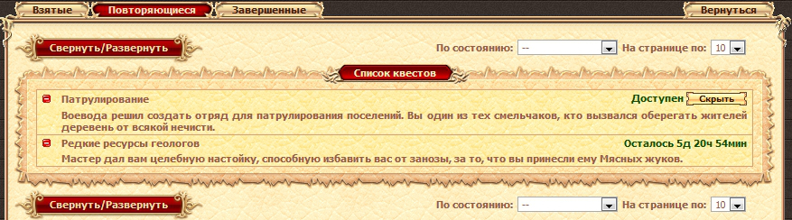 В соседней вкладке находится список завершенных вами заданий и повторяющихся квестов, которые вы можете пройти еще раз.