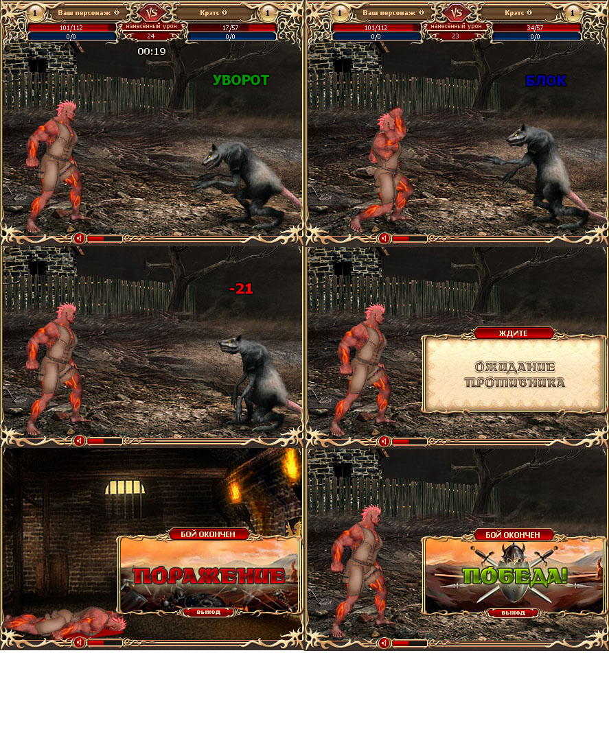 Поражение - к сожалению, ваш противник оказался сильнее, и вам следует посетить ближайший храм, что бы воскреснуть для дальнейших подвигов.