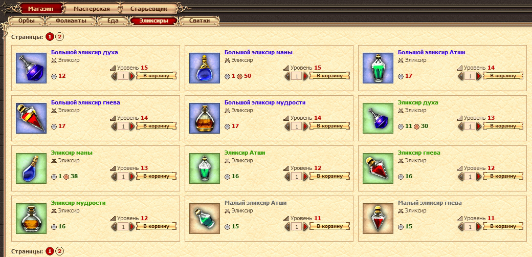 Существуют предметы, увеличивающие мудрость и интеллект, и средства восполнения израсходованной в бою маны. К таким предметам относятся эликсиры и свитки. Их тоже можно приобрести в магическом магазине в